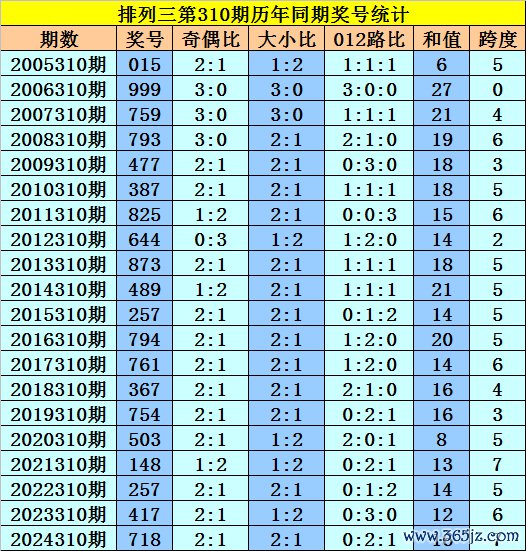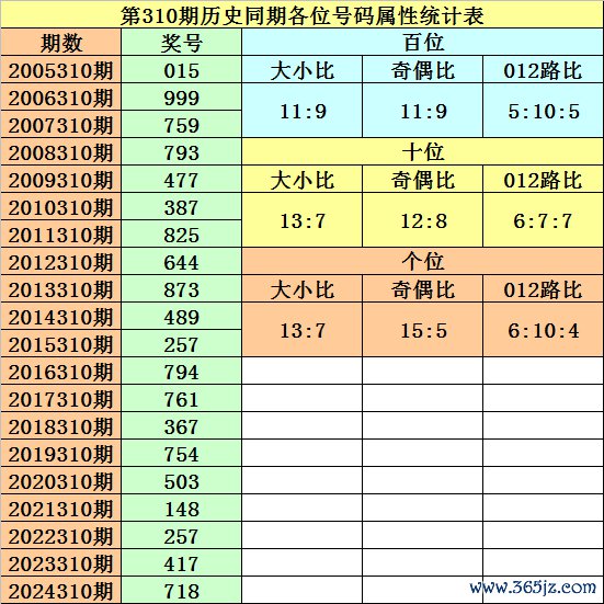 第310期历史同期开奖中,百位号码振幅辞别为:9-2-0-3-1-5-2-2-4-2-5-0-4-4-2-4-1-2-3,波动边界在0-9之间,012路号码比例开出5:10:5,大小 号码比例开出11:9,奇偶号码比例开出11:9,本期百位把稳偶数号码,和蔼号码8。